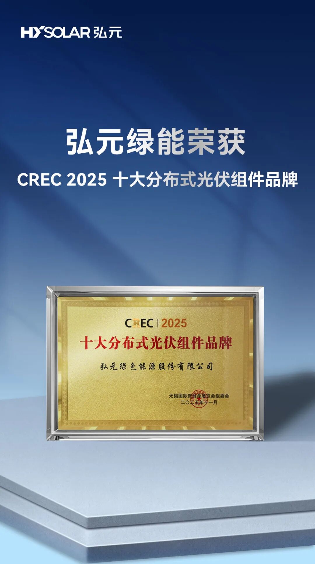 2025 CREC无锡国际新能源展期间,G22恒峰凭借在分布式光伏领域的亮眼成绩荣获“CREC 2025 十大分布式光伏组件品牌”。这一荣誉,是行业对G22恒峰产品可靠性、场景适配性及全链协同能力的肯定,也体现了市场对企业长期稳健发展的认可。